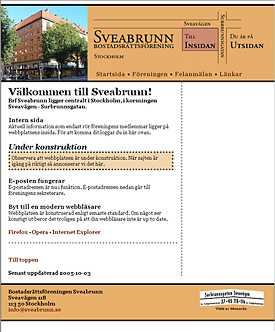 Bostadsrättsföreningen Sveabrunn. Intranät med inloggning för medlemmar. Uppdateras med Macromedia Contribute. Okt 2005.